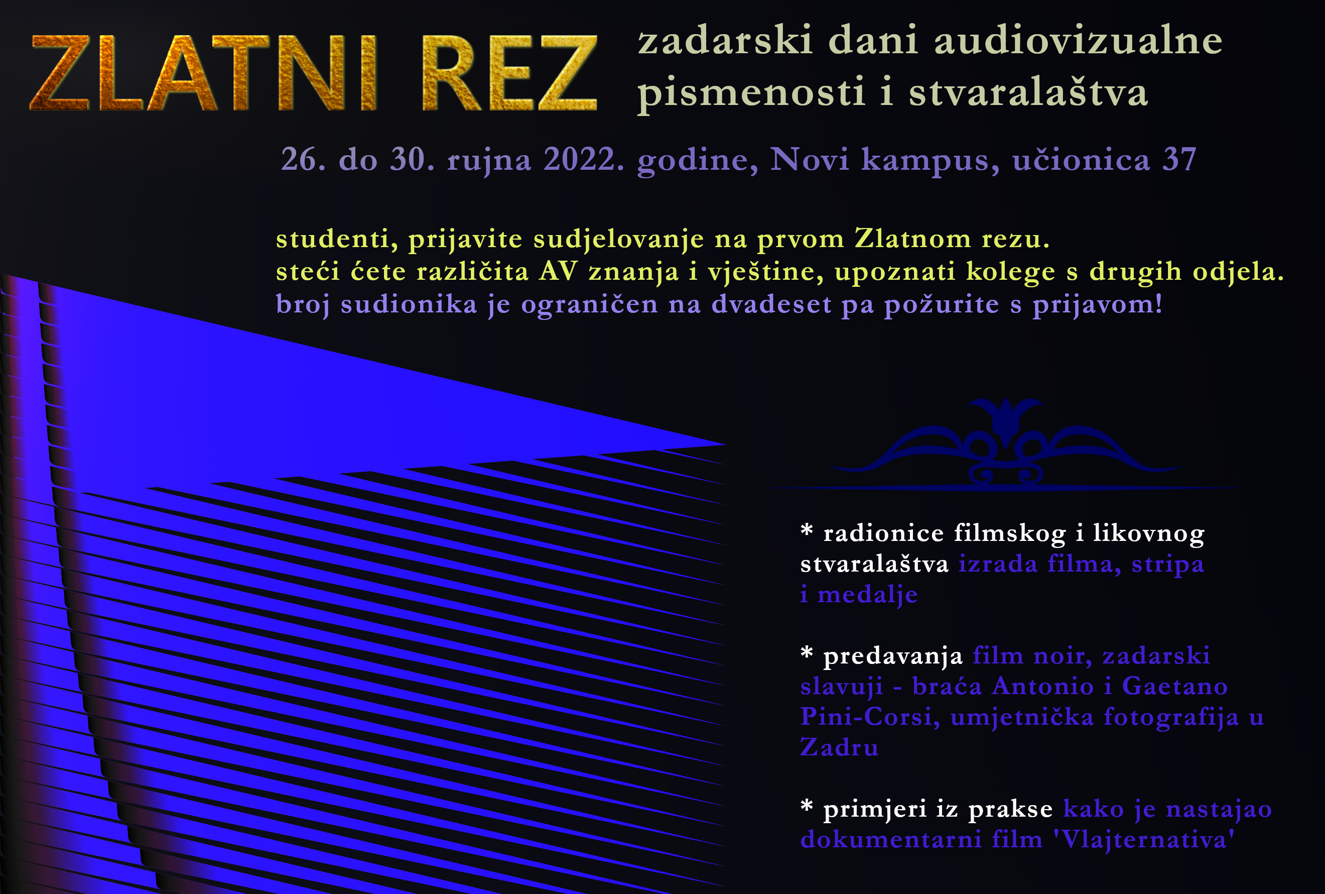 pozivamo vas da se prijavite na sudjelovanje u ljetnoj školi “Zlatni rez” gdje možete steći različita znanja i vještine iz polja audiovizualnih medija. Ljetna škola će se održati od 26. do 30. rujna 2022. na Novom kampusu. Kroz filmske i likovne radionice stjecat ćete saznanja o različitim aspektima izrade filmova, stripova i medalja, a ujedno i izrađivati djela u ovim medijima. Na Zlatnom rezu će također biti održana predavanja o različitim temama povezanim s audiovizualnim medijima - od film noira do značajnih zadarskih fotografa i glazbenika. Sudionici ove manifestacije imat će priliku detaljnije se upoznati i s primjerima iz suvremene audiovizualne prakse, konkretno, s procesom izrade dokumentarnog filma 'Vlajternativa', filma kojim se predstavlja istoimena glazbeno-kulturna manifestacija u Benkovcu.