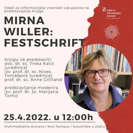 Odjel za informacijske znanosti Vas s radošću poziva na predstavljanje knjige objavljene u čast dr. sc. Mirne Willer, redovite profesorice u miru, koje će se održati u ponedjeljak, 25. travnja 2022. u 12.00 h u Multimedijalnoj dvorani Novog kampusa, Ulica dr. Franje Tuđmana 24i.