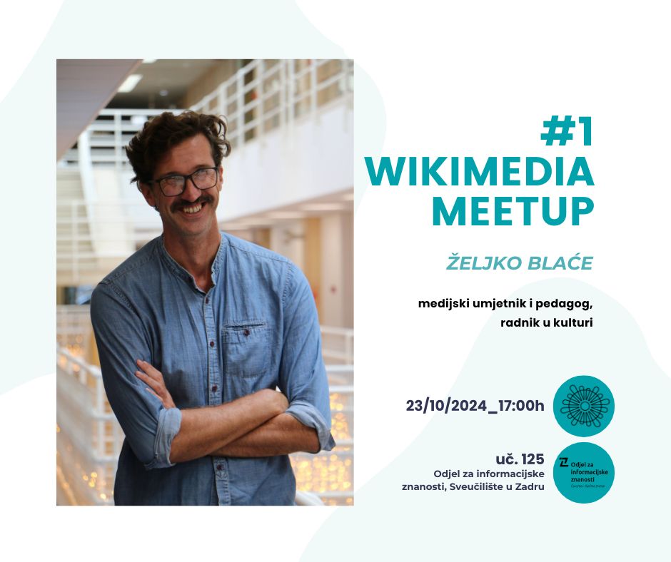 Pozivamo vas na #1 Wikimedia MeetUp-a u srijedu 23. listopada 2024. godine u 17:00 sati (Novi kampus, uč.125) na temu odnosa Wikipedije i Wikimedija. Gost je diplomirani (medijski) umjetnik i pedagog, te kulturni radnik Željko Blaće. Radi kao nezavisni konzultant u neformalnoj edukaciji, a organizator i producent je događaja koji promoviraju otvorene sustave i participativnost. Vjerujemo da ste svi bazično informirani o Wikipediji ali da će vas i dublje zanimati o Wikimediji - ekosustavu za otvoreno publiciranje znanja, podataka, medija, koda, te dublje o metodama rada. Fenomen Wikipedije i Wikimedija će biti predstavljen iz perspektive profesionalca za profesionalni rad stručnoj akademskoj publici. U 20-30 minuta pregleda potaknut ćemo sagledavanje ključnih pitanja te otvoriti diskusiju na teme koje prepoznate kao urgentnije i relevantnije za vaš rad.